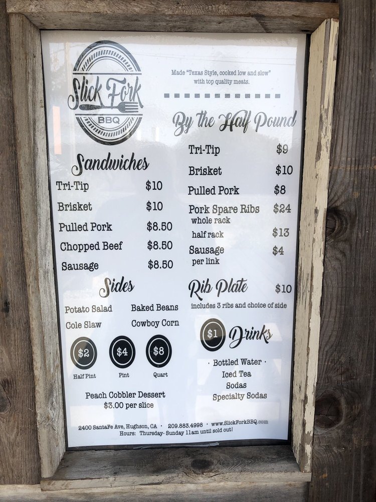 Introducing Slick Fork BBQ, a barbecue haven located in Hughson, CA. This casual spot offers a range of delicious meats by the half pound, including brisket, chicken, pork spare ribs, pulled pork, sausage, and tri-tip. For sandwich lovers, options like brisket, chicken, pulled pork, and tri-tip are available. Sides like baked beans, cole slaw, and mac n' cheese complement the hearty meats perfectly. With options for vegetarians and great choices for groups, Slick Fork BBQ is a versatile spot for a satisfying meal. The outdoor seating, happy hour specials, and friendly waiter service add to the overall experience. Whether you're looking to dine in, take out, or have your event catered, Slick Fork BBQ has got you covered. Don't miss out on this BBQ gem!